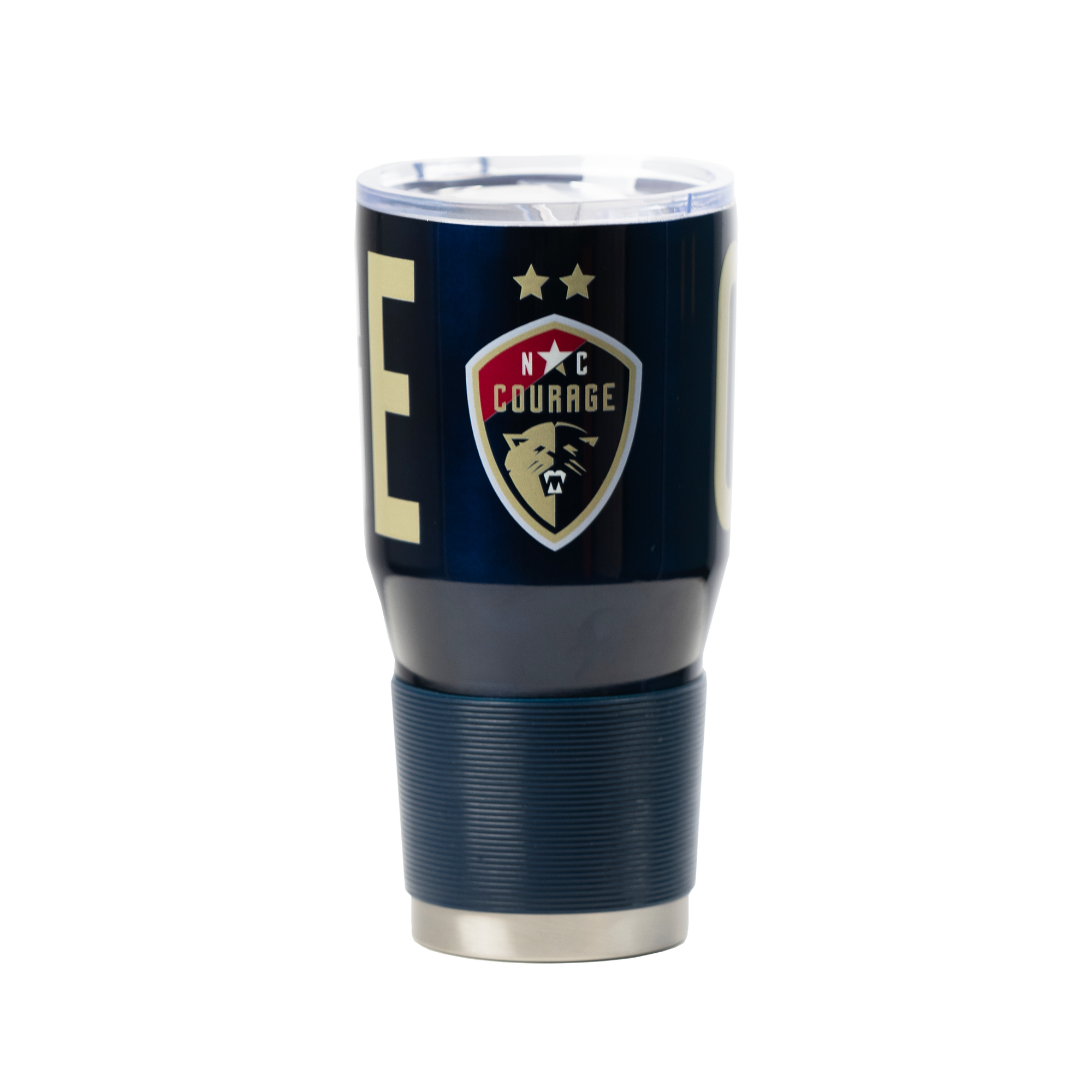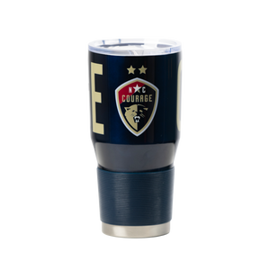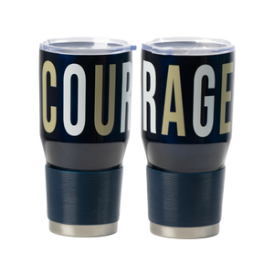 30oz stainless tumbler featuring the Courage crest and wording around the body and a rubber grip. Keeps liquids hot or cold and fits in standard cup holder