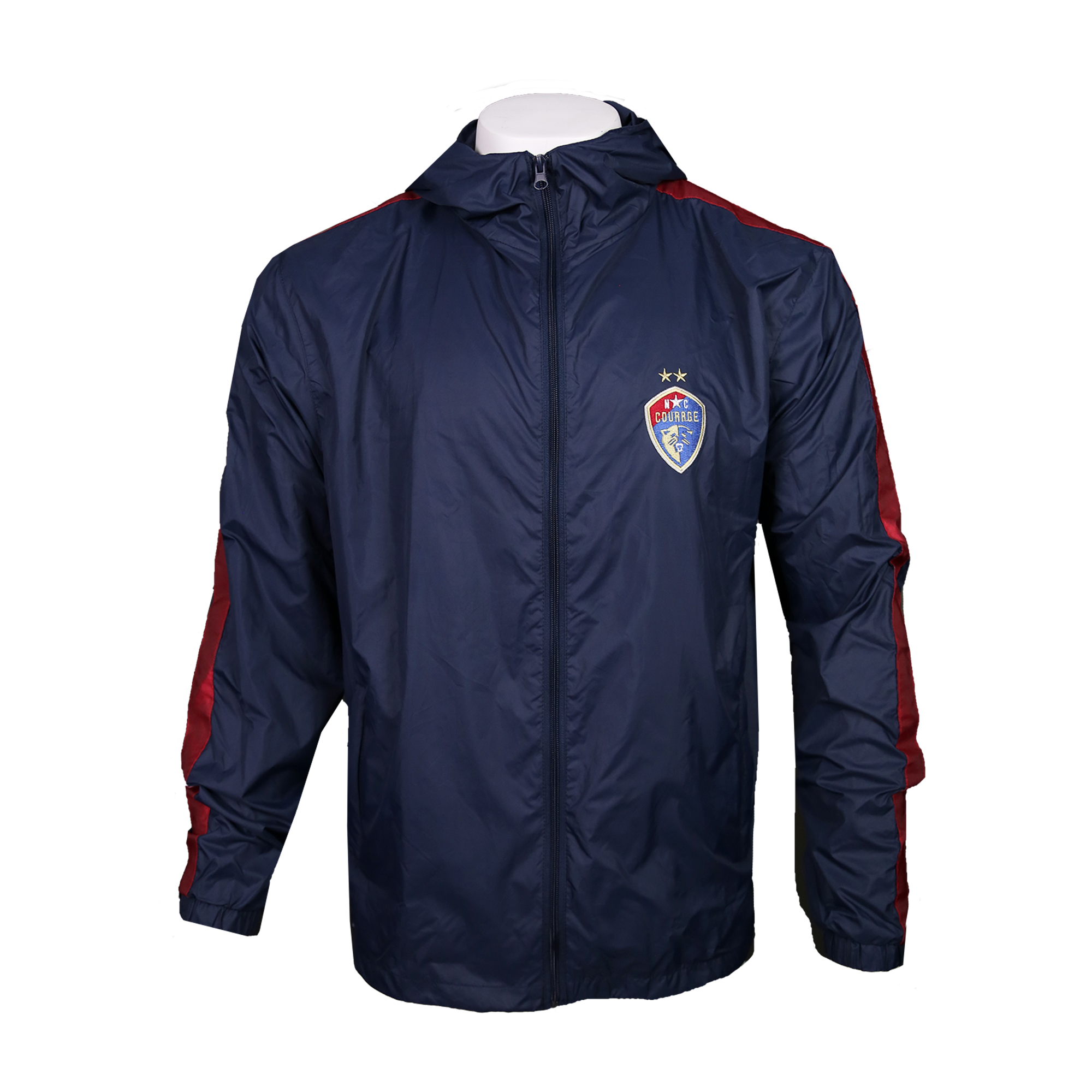 This navy full-zip wind jacket is perfect for those chilly night games. Featuring red striped contour down the sleeves, fully embroidered Courage logo, and zippered pockets.