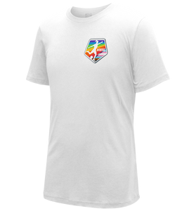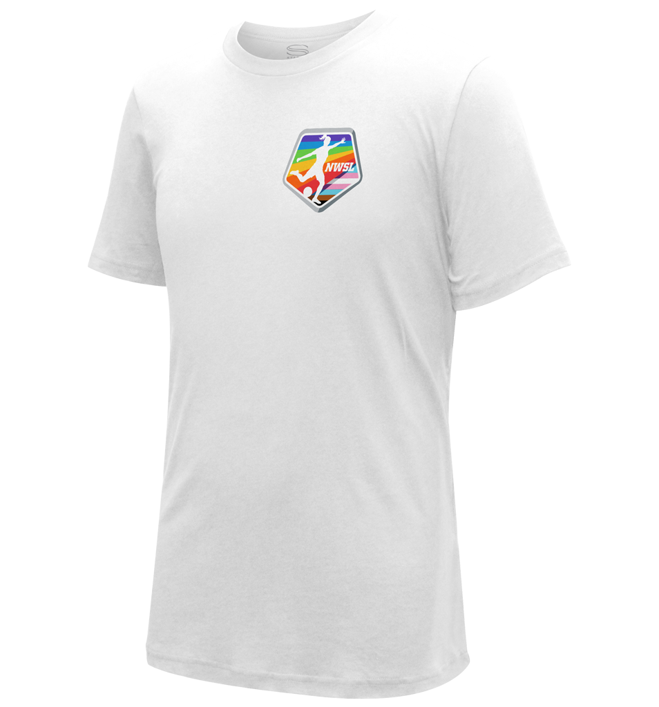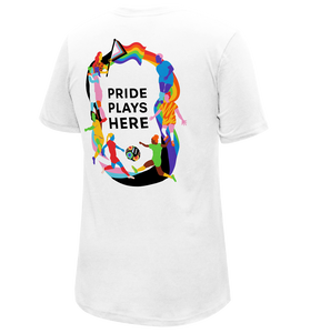 Show your support for the NWSL with this vibrant tee featuring the "Pride Plays Here" slogan and an unique design handcrafted by Queer visual artist Sophia Yeshi, whose colorful and bold work amplifies Black women, women of color, and folks in the LGBTQIA+ communities.