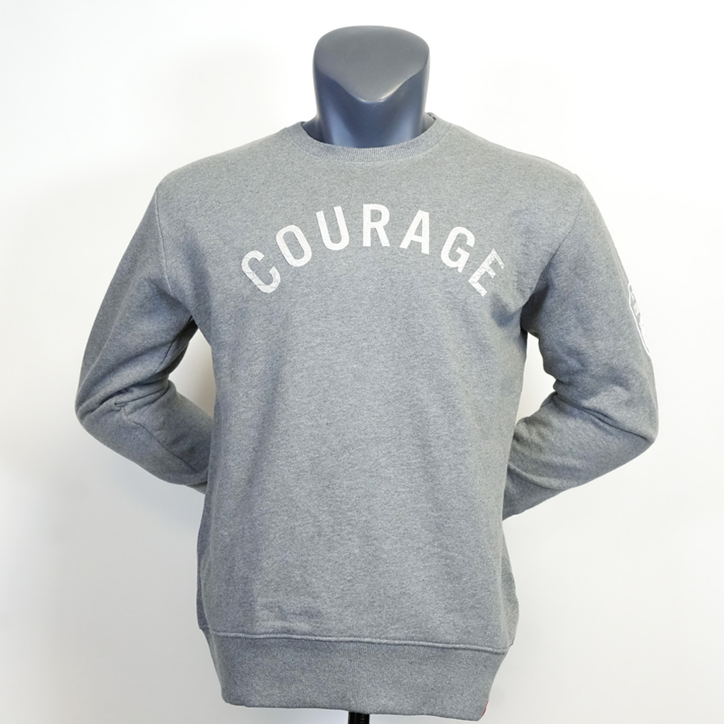 A navy blue crewneck sweatshirt with the NC Courage logo and the word ' COURAGE ' written across the chest in bold letters.