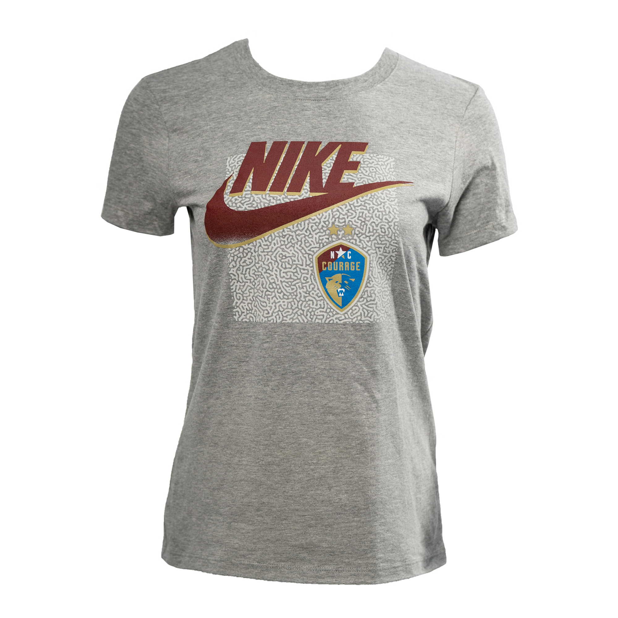Nike mezzo pattern in white on a grey tee featuring a large gradient maroon and gold Nike Futura swoosh above the NC Courage two-star full color logo.